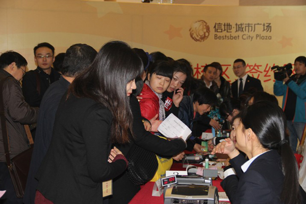 上午9:18在一曲活力四射的法国康康舞开场后,摇号正式开始,每次摇出10名客户进入售楼处内选房。第一批幸运客户新鲜出炉,难以掩饰内心激动,火速在工作人员的带领下进入选房区,先后完成选房、缴纳定金、签约等选房工作,选房只用1分钟可以说是对客户最好的描述,客户直言:早就选定了心中的意向楼层和房号了,坐等好运来临!第一批客户按部就班的完成选房流程,场外的摇号工作也在热火朝天的进行,近1小时内房源表上就一片飘红,成功销售355套房源,用“抢”字是对选房情景最好的形容!
